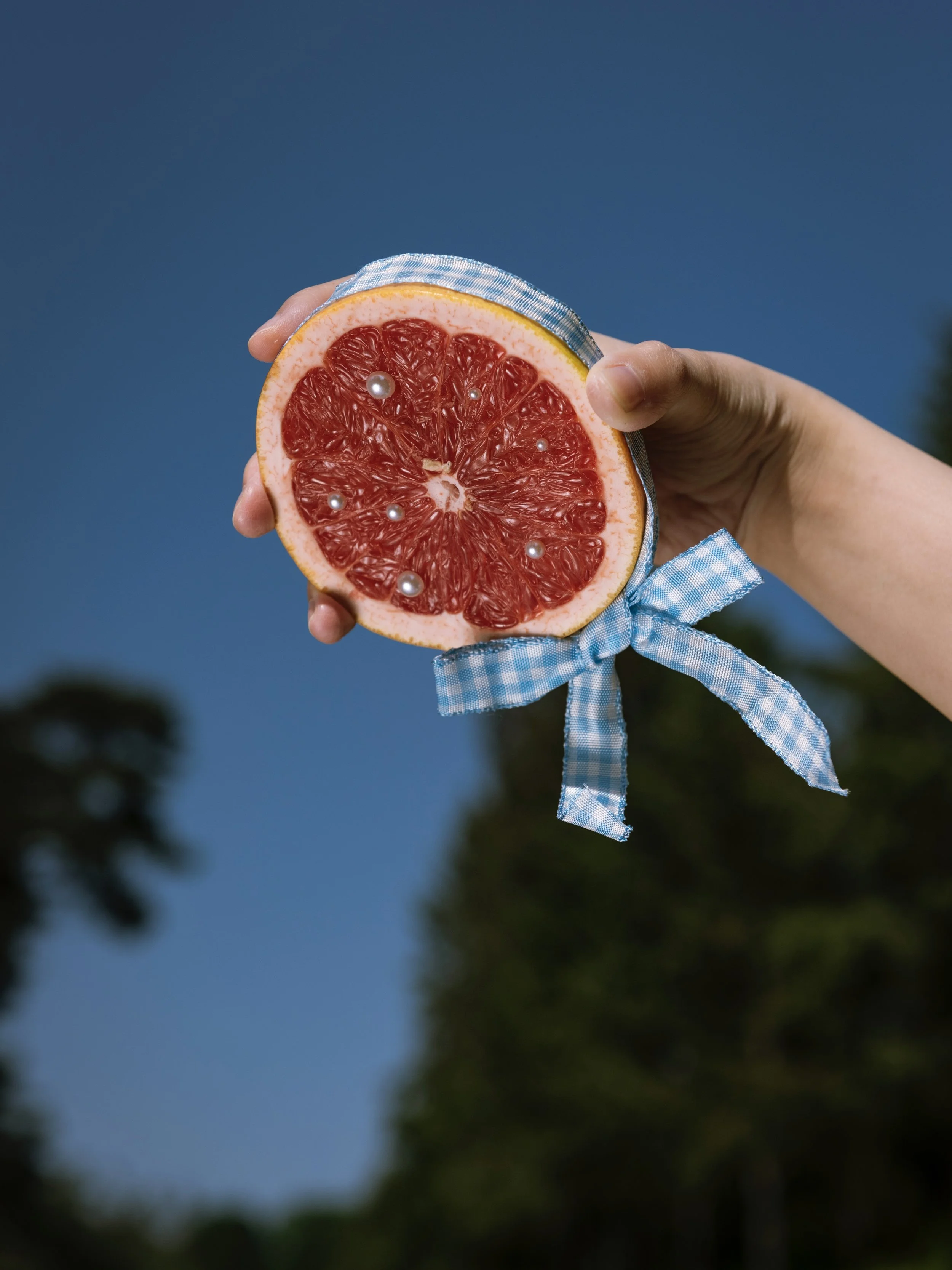 Toast sewn with delicate ribbons, a chess set made of colorful haribos, spots on the skin in the shape of pearls, a grapefruit lifted in mid-air… As I designed and took these strange, bright, and somewhat decadent photographs, I surprisingly began to feel clearly that the emotions of these re-perceived objects were like a river, trickling through my body. From my fingertips to my chest, to behind my ears. Most marvelously, I could even experience the process of changing emotions. At different moments, whenever I tried to clarify what I was feeling from those objects at the moment, I could describe it with different adjectives.